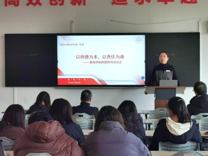为响应省教育安全会议精神,进一步推进期末重点工作,新闻学院于12月18日下午召开全院教师大会,对2024-2025第一学期的期末工作进行详细的部署。重点强调师德师风建设,从期末考务工作内容、毕业论文指导、学业指导工作进行详细的部署。新闻学院院长、副院长及各系主任和全体教师参加会议。本次会议由副院长张潇予主持。