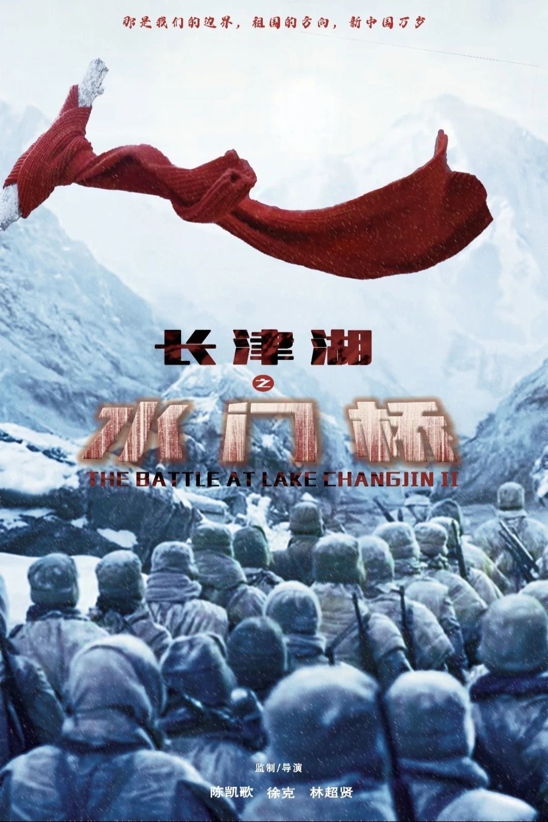 设计说明:海报以冷色调为主,营造出冰天雪地的战场氛围。画面中志愿军战士们穿着厚重的冬装,整齐地向前行进,展现出坚定的意志。上方飘扬的红围巾为画面增添了一抹亮色,象征着希望和热血。电影名称醒目地置于中间,背景的雪山强化了环境的恶劣。