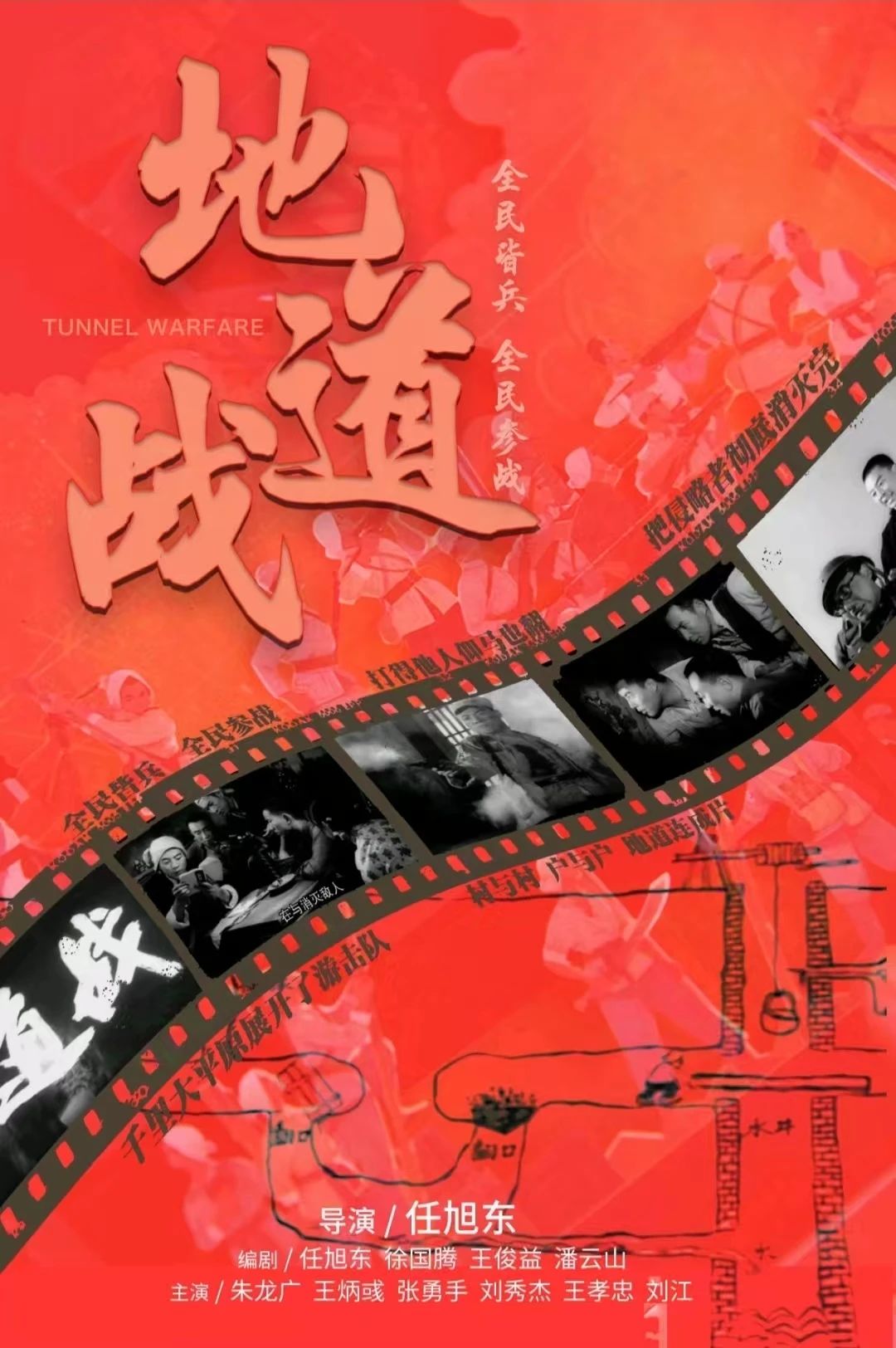 设计说明:海报以红色为主色调,充满了革命的激情与热血。“地道战” 三个大字醒目地位于中央,字体设计具有年代感。旁边的胶片设计嵌入了电影中的场景,展示了战斗和军民生活画面,具有很强的叙事感。