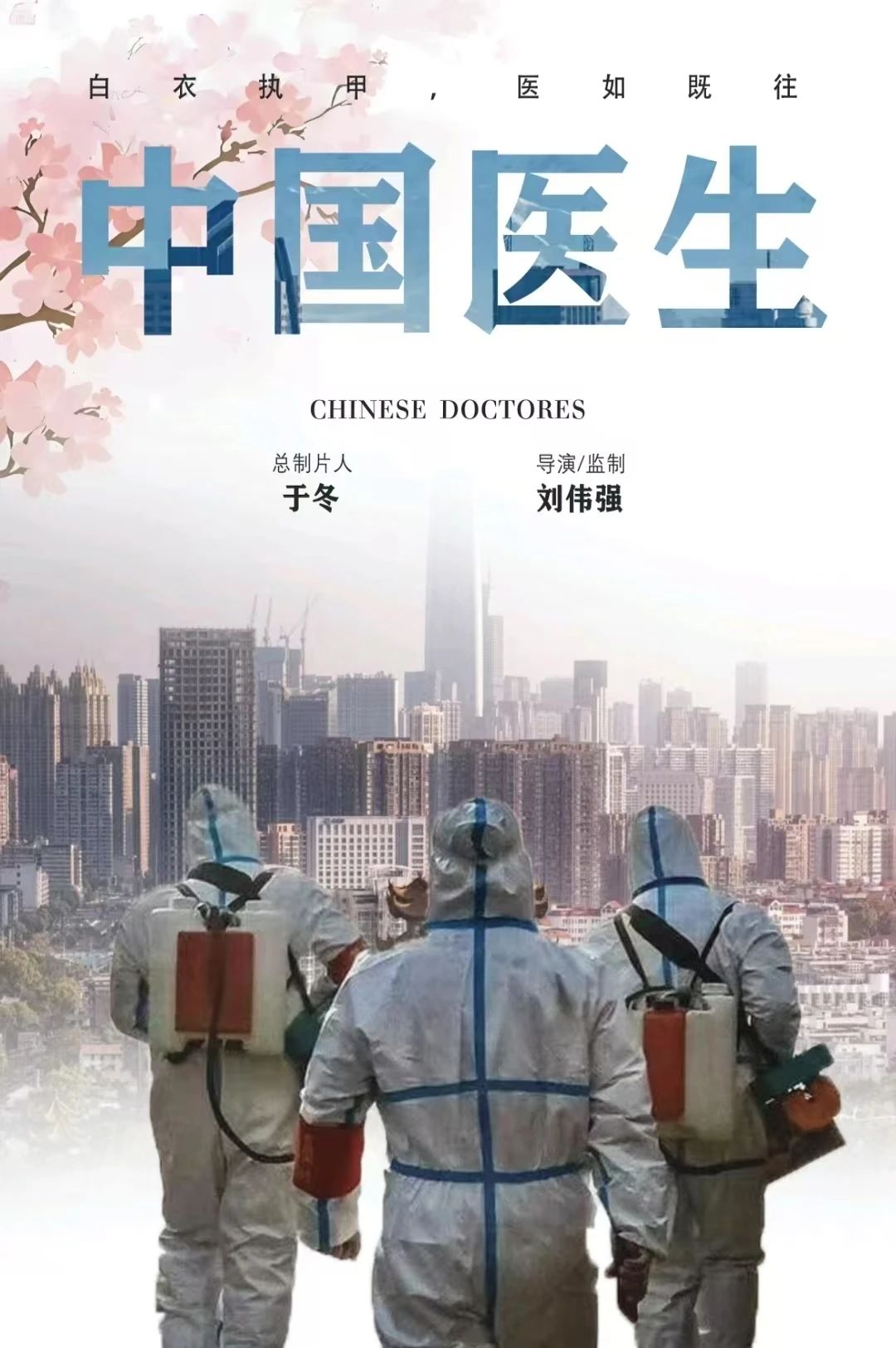 设计说明:海报以淡粉色和白色为主色调,给人一种温暖而又专业的感觉。画面中三位穿着防护服的医护人员背影坚定地朝向城市,象征着他们守护城市的决心。上方的樱花树枝象征着希望和春天,“白衣执甲,医如既往” 体现了医护人员的无私奉献。“中国医生” 四个大字醒目,下方是英文翻译和主创人员信息。