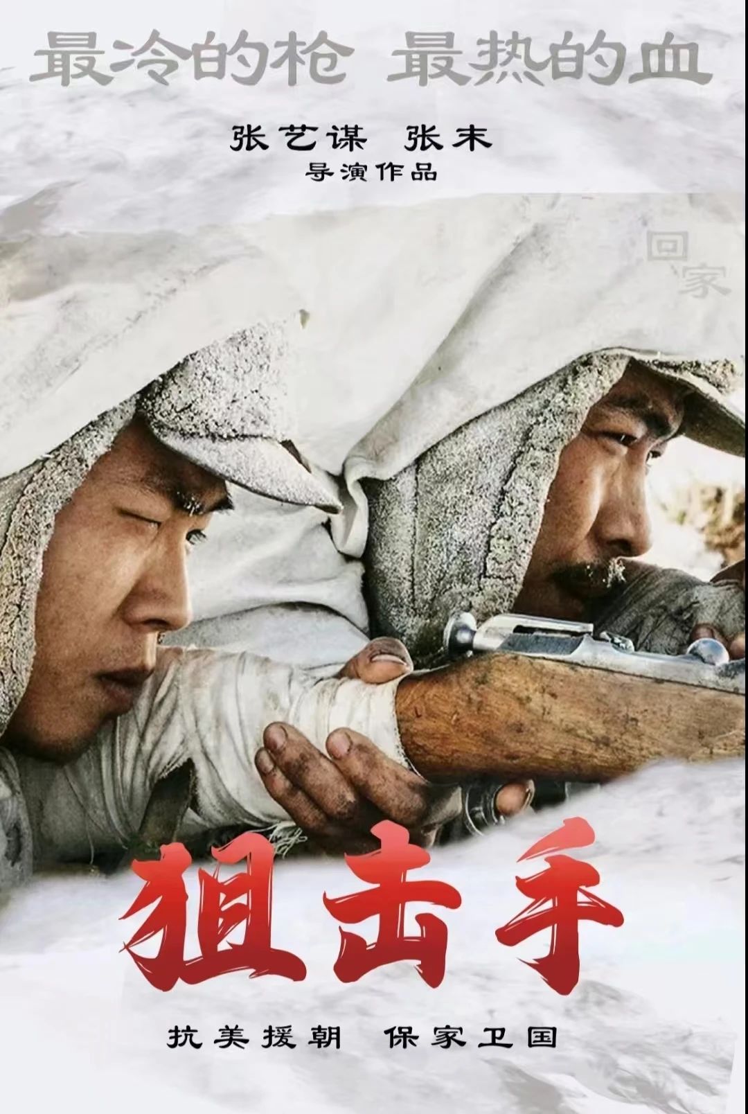 设计说明:海报以冷色调为主,营造出冰天雪地的氛围。画面中两名志愿军战士专注于狙击任务,他们身着厚重的冬装,脸上有冻伤的痕迹,体现出战争的艰苦。战士手中的枪和坚定的眼神传递出一种紧张感。海报上方 “最冷的枪 最热的血” 点明主题,下方 “抗美援朝 保家卫国” 突出影片背景。