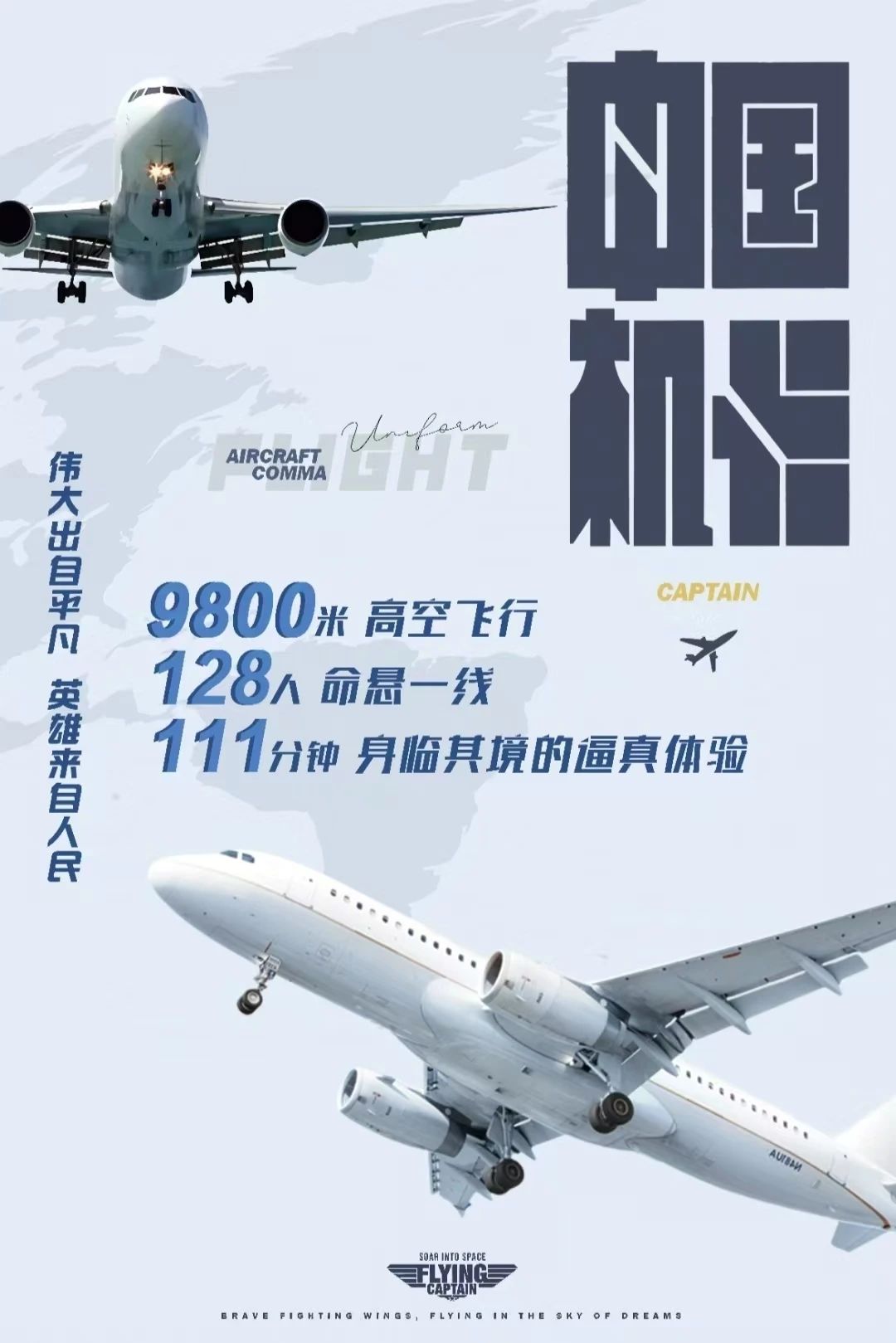 设计说明:海报以航空为主题,背景为浅蓝色,营造广阔天空的感觉。海报中两架飞机展现出飞行的动感与力量。海报中央用大字写着 “中国机长”,突出主题。文案“9800 米高空飞行”“128 人生命悬一线”等,强调了影片的惊险、紧张氛围。整体设计简洁大气,具有视觉冲击力。