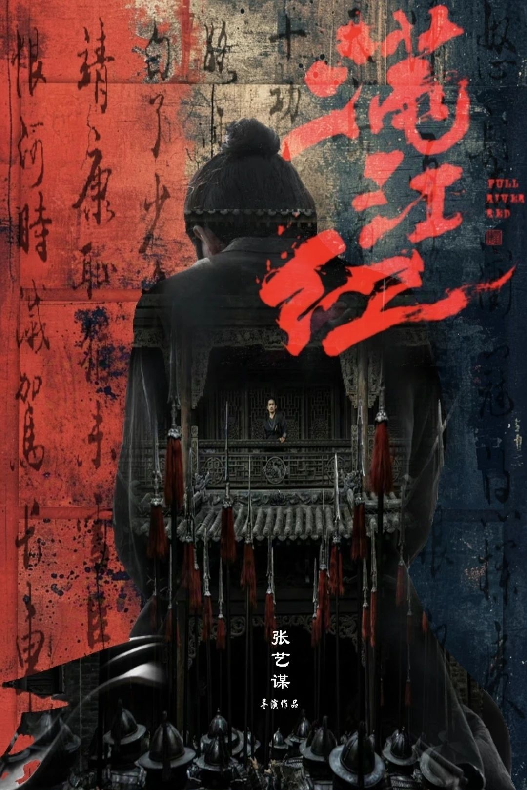 设计说明:海报采用了红、黑、蓝三色为主色调,色彩对比强烈,营造出紧张的氛围。画面中心是一位背对观众的人物,给人一种神秘莫测的感觉。背景中的古代建筑和士兵,以及飞扬的红缨枪,暗含原片意味。红色的 “满江红” 三个字十分醒目,彰显影片主题。