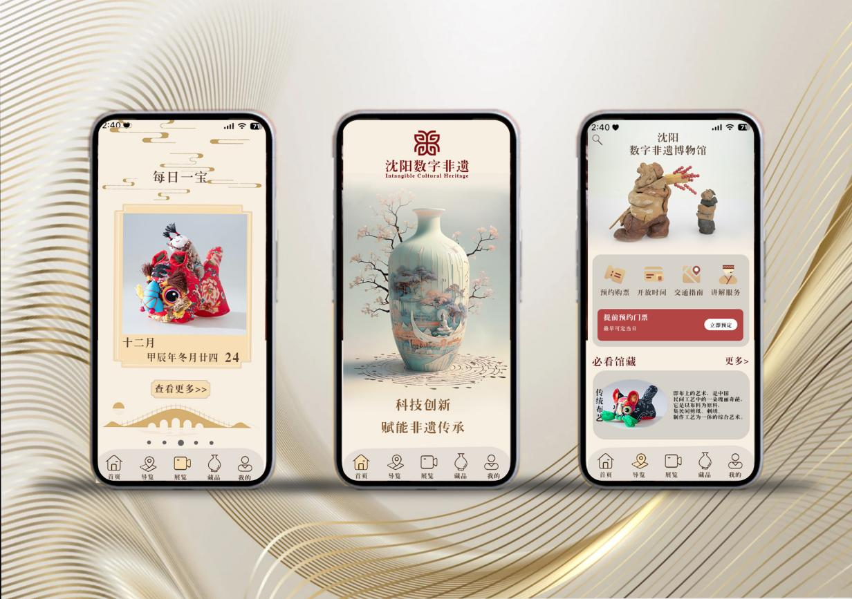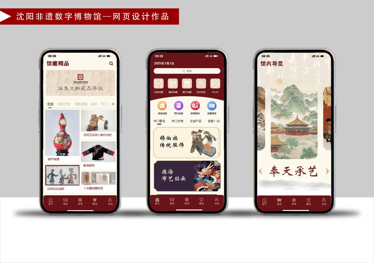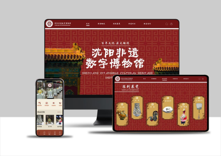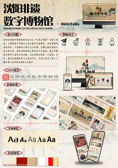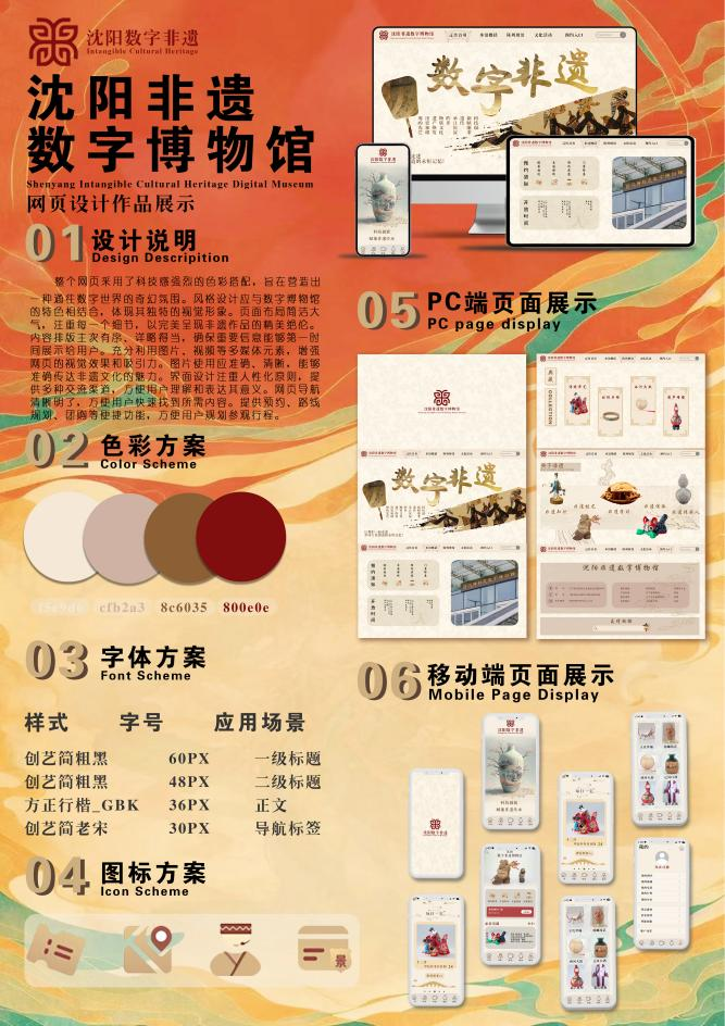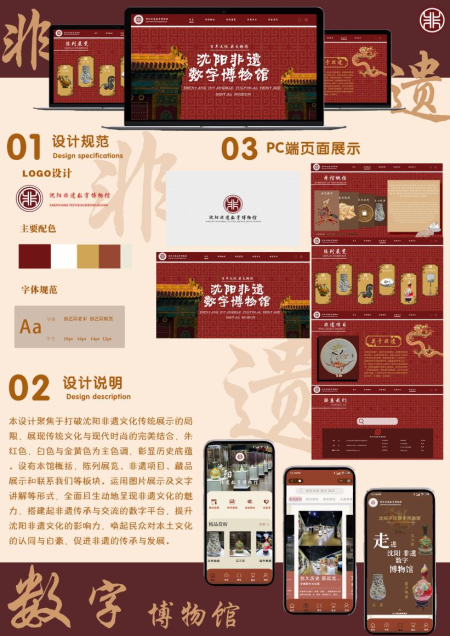 本设计聚焦于打破沈阳非遗文化传统展示的局限,展现传统文化与现代时尚的完美结合,朱红色,白色与金黄色为主色调,彰显历史底蕴,设有本馆概括,陈列展览、非遗项目、藏品展示和联系我们等板块,运用图片展示及文字讲解等形式,全面且生动地呈现非遗文化的魅力,搭建起非遗传承与交流的数字平台,提升沈阳非遗文化的影响力,唤起民众对本土文化的认同与自豪,促进非遗的传承与发展。