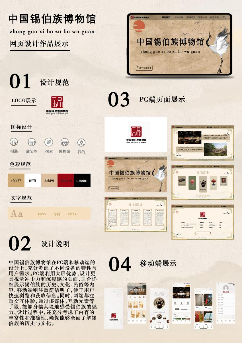 本网页设计围绕“奉天承艺、古艺薪声、盛京味道、匠心筑梦”四大主题展开设计,旨在展示沈阳丰富的非物质文化遗产。在本次网页设计中,我们重点展示消失锡伯族的传统服饰和习俗。通过这些设计,我们希望为观众提供一个全方位、多角度了解沈阳非遗文化的平台,让更多的人能够感受到非遗文化的独特魅力和深厚底蕴。