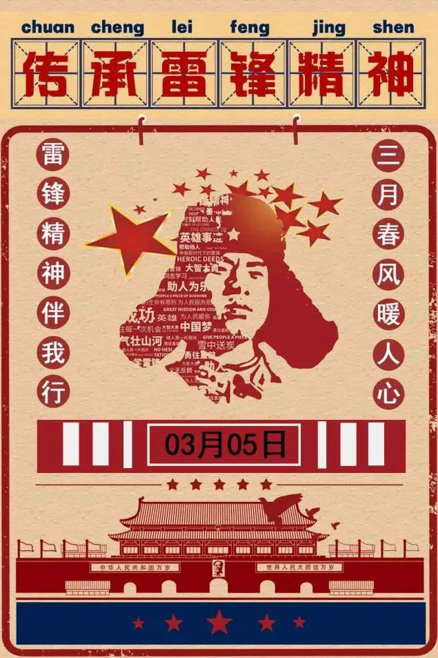 海报以鲜明的视觉元素传递传承雷锋精神的主题,唤起人们对雷锋事迹的深刻记忆。雷锋头像置于核心,周围环绕相关事迹、精神的关键词,直观展现其精神内核。以“传承雷锋精神” 点明主旨,天安门元素增添庄重感,象征雷锋精神与国家、人民紧密相连。两侧标语营造氛围,3月5日雷锋纪念日突出,强化时间记忆点。