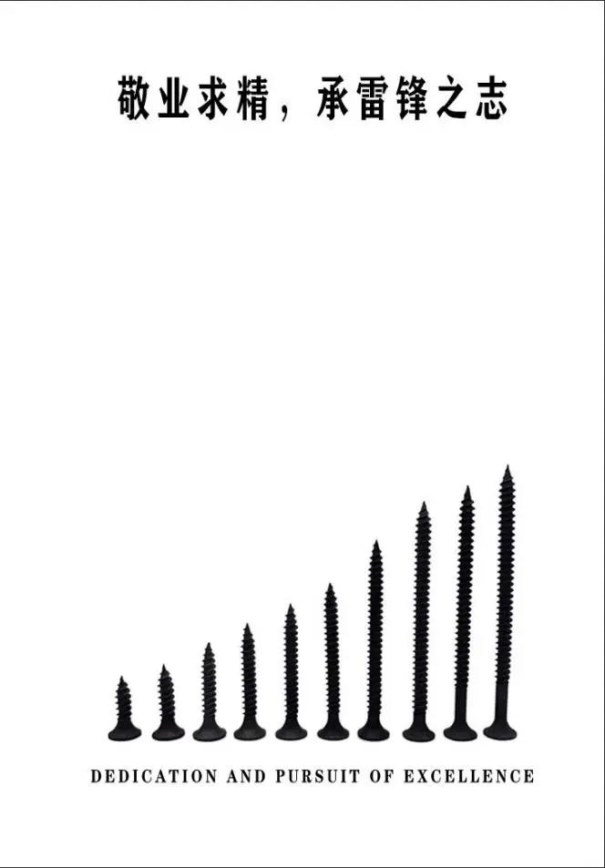 以钉子逐步增高为中心,象征个人在践行雷锋精神过程中,从初涉岗位或公益奉献的新手,不断积累经验、提升能力,像螺丝钉从短小变得修长一样,在思想境界和实际贡献上持续进步,实现从平凡到优秀、从优秀到卓越的成长蜕变,表示个人在社会中发挥的作用不断增大。新时代对人才和公民素质要求不断提高,螺丝钉越来越高契合这一趋势,代表着在时代发展进程中,人们不断自我完善、自我超越,以更高标准、更强能力适应新挑战,为国家建设和民族复兴贡献更大力量。