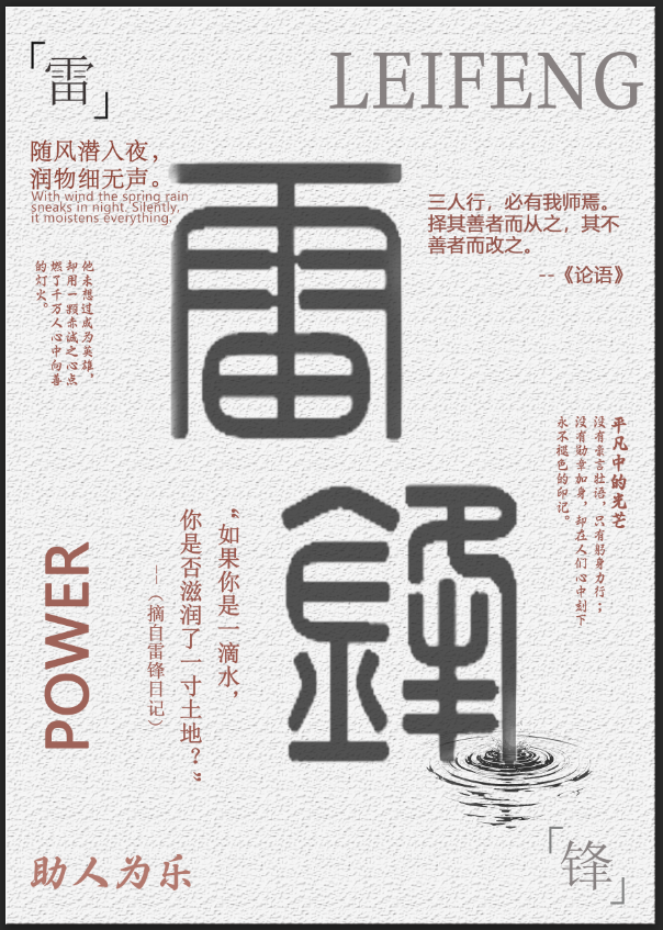 本海报以文字设计为主,主要突显“雷锋”助人为乐,无私奉献,是我们学习的榜样。标题“雷锋”采用篆写字,使其具有独特的艺术美感。描写雷锋的句子简约而富有感染力,可以很好的传递给我们正能量,句子字体颜色为红色,红色象征热情与信仰,醒目又有温度。海报中的水波纹与雷锋日记中所写的“如果你是一滴水,你是否滋润了一寸土地?”相呼应。“水”的特性与雷锋精神相似,水温柔而有力量,细腻且无声,与雷锋助人为乐,却又不言奉献的精神一样,无声却震耳欲聋。