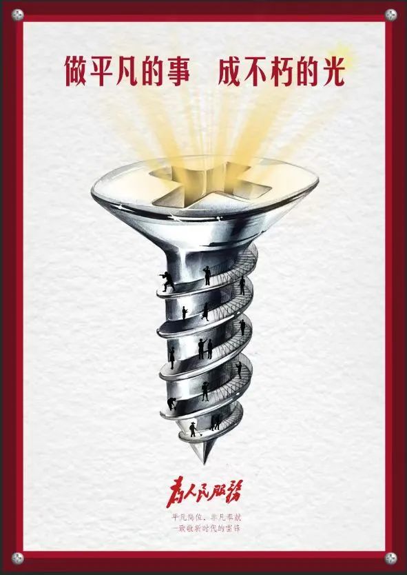 海报以钉子为主体,在钉子顶端上放置五角星,让钉子从视觉上变成一座灯塔,在钉子中雷锋精神的滋养下,五角星散发出纯洁的光,光辉映照下雷锋精神的核心精髓——为人民服务也随之体现,同时钉子以“物化符号”提炼雷锋精神中“做一颗永不生锈的螺丝钉”的经典意象,既强化视觉冲击,又以具象载体传递“平凡铸就伟大”的深刻哲思。