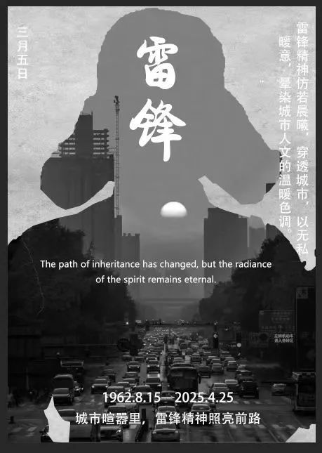 以1962-2025时间轴串联雷锋精神跨时空传承,双语铭刻“方式焕新,精神永驻”。通过独特的双重曝光艺术风格,融合城市街景与人物轮廓,在光影文字间熔铸精神脉络。以虚实叠影重构时代棱镜与温情印记,于喧嚣中沉淀永恒的精神底色。