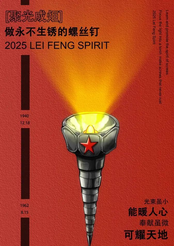 海报将钉子转化为手电筒造型,钉子象征雷锋 “螺丝钉精神”,代表在平凡岗位的坚守,而手电筒则是发光发热、照亮他人的象征。从钉子到手电筒的转变,象征雷锋精神从默默坚守,发展为主动发光、温暖他人。头部红星醒目,强化精神内核。“聚光成炬” 体现个体力量汇聚的强大,主动奉献,照亮社会。