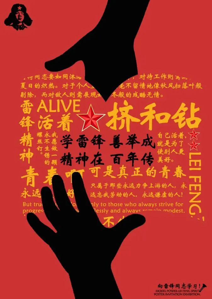 本次雷锋精神主题海报展以“传承雷锋精神”为创作内核,通过平面设计语言诠释新时代雷锋精神。同学们将红色信仰注入视觉符号,作品以螺丝钉为主视觉,喻示雷锋“钉子精神”永不停转的时代传承。这场视觉盛宴不仅展现同学们的设计功力,更用现代艺术语言编织出跨越时空的精神纽带,让雷锋精神的火种在笔锋与像素间永恒跃动。