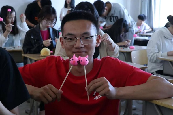 活动开始前,董辉老师分发事先准备好的面泥。在为同学们分好面泥之后,他开始一步一步教同学们如何制作。他说:“面塑看起来并不起眼,但要求手上功夫得细,心里也不能急躁,这样才能捏出好作品”。同学们按照董辉老师的讲解,把一块普通的面泥捏出了一个个可爱的面塑作品,大家看着自己亲手捏出的作品,都露出了灿烂的笑容。