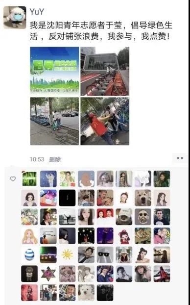 配好主题文案 “我是沈阳青年志愿者+姓名,倡导绿色生活 ,反对铺张浪费,我参与,我点赞!”