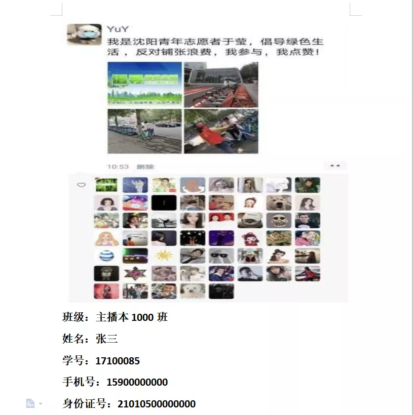 8.将朋友圈点赞截图以及个人信息:姓名、电话、身份证号码发送给班级团支书,由各班团支书汇总到一个word文档内,交于对接干事处。(如示例图三)