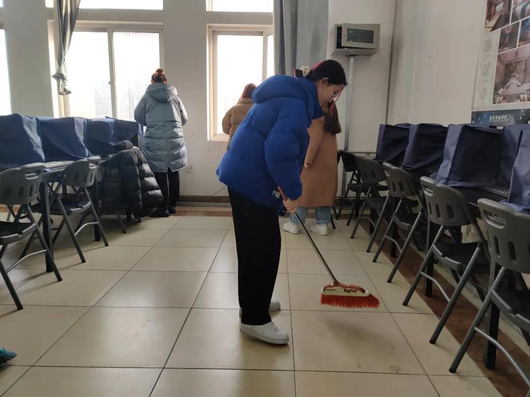 在清扫活动中同学们对机房实训教室的室内窗户窗台进行打扫,对地面进行了全方位的清洁,对实训室的设备进行了设备的清洁和维护。在体育馆进行了物品分类整理与椅子摆放。
