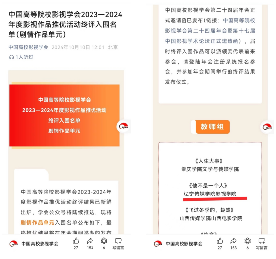 此次入围中国高等院校影视学会年度推优活动,是对王森副教授多年来辛勤耕耘和不懈努力的肯定。他的作品《他不是一个人》在剧情构思、人物塑造、镜头语言等方面都表现出色,获得了评审委员会的高度认可。此次入围不仅提升了王森副教授个人的知名度,也为太阳成集团官方网站电影学院赢得了荣誉。