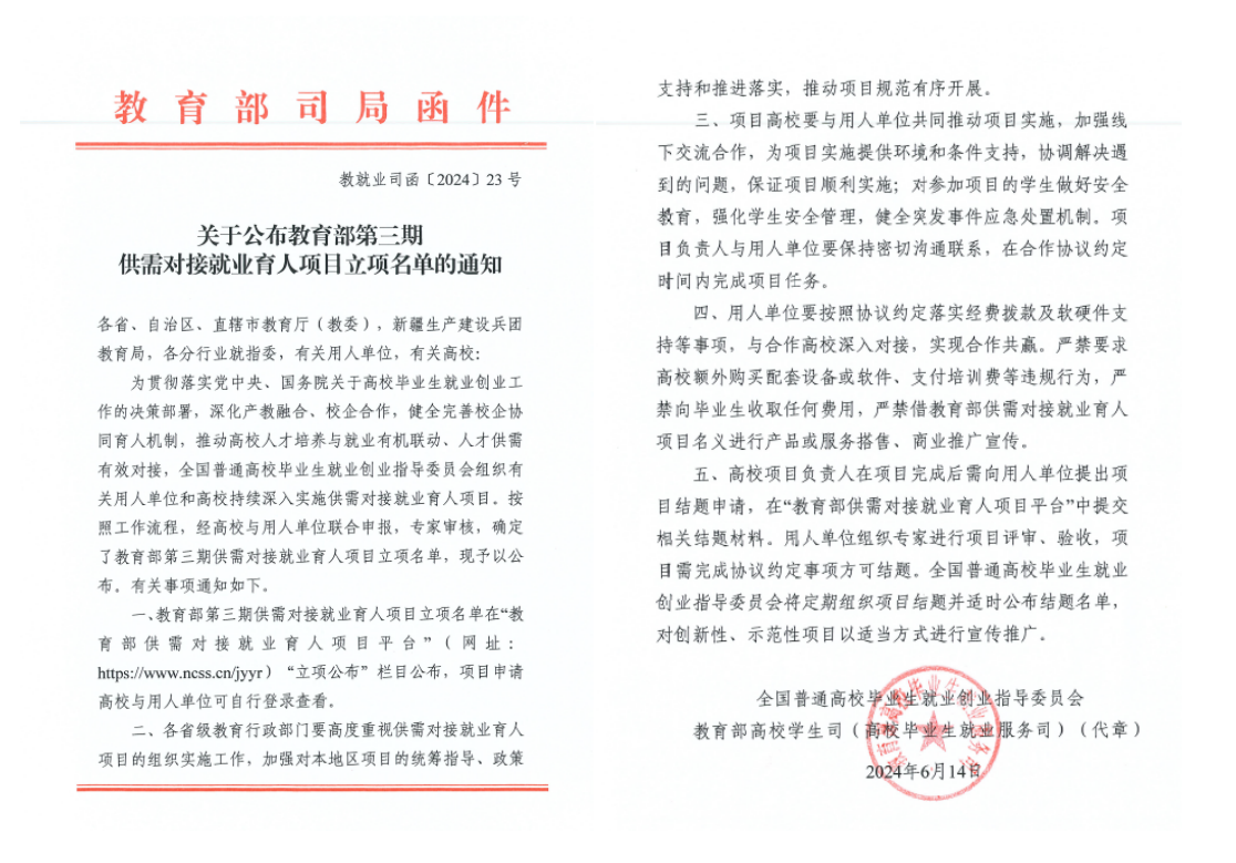 供需对接就业育人项目是教育部贯彻落实党中央、国务院关于高校毕业生就业创业工作决策部署,深化产教融合、校企合作,健全完善校企协同育人机制,推动高校人才培养与就业有机联动、促进人才供需有效对接的重要举措,旨在汇聚更多社会力量共同推进高校毕业生高质量充分就业。