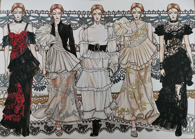 本次展出的是17级和18级的项目包作品,17级是高级礼服设计与制作、18级是单品服装设计与制作项目包,展出的核心课程是《服装立体裁剪》和《服装效果图表现》两门课程作品。《服装立体裁剪》项目作品是结合企业的实际案例,按照汪正影业的要求设计和制作的高级礼服,期末成品做出后部分优秀作品将会被企业投入到实际的拍摄使用中。《服装效果图表现》是结合日月新服饰的实际案例,按照企业的要求进行设计。学生们通过这个项目包的学习能够了解企业的实际需求,在教师的指导下完成作品,同时作品在符合企业需求的同时,教师也要求同学们投稿一些符合比赛要求的项目,通过“展、赛”的形式,让同学们能够在参赛的过程中不断地提高自己的专业水平。