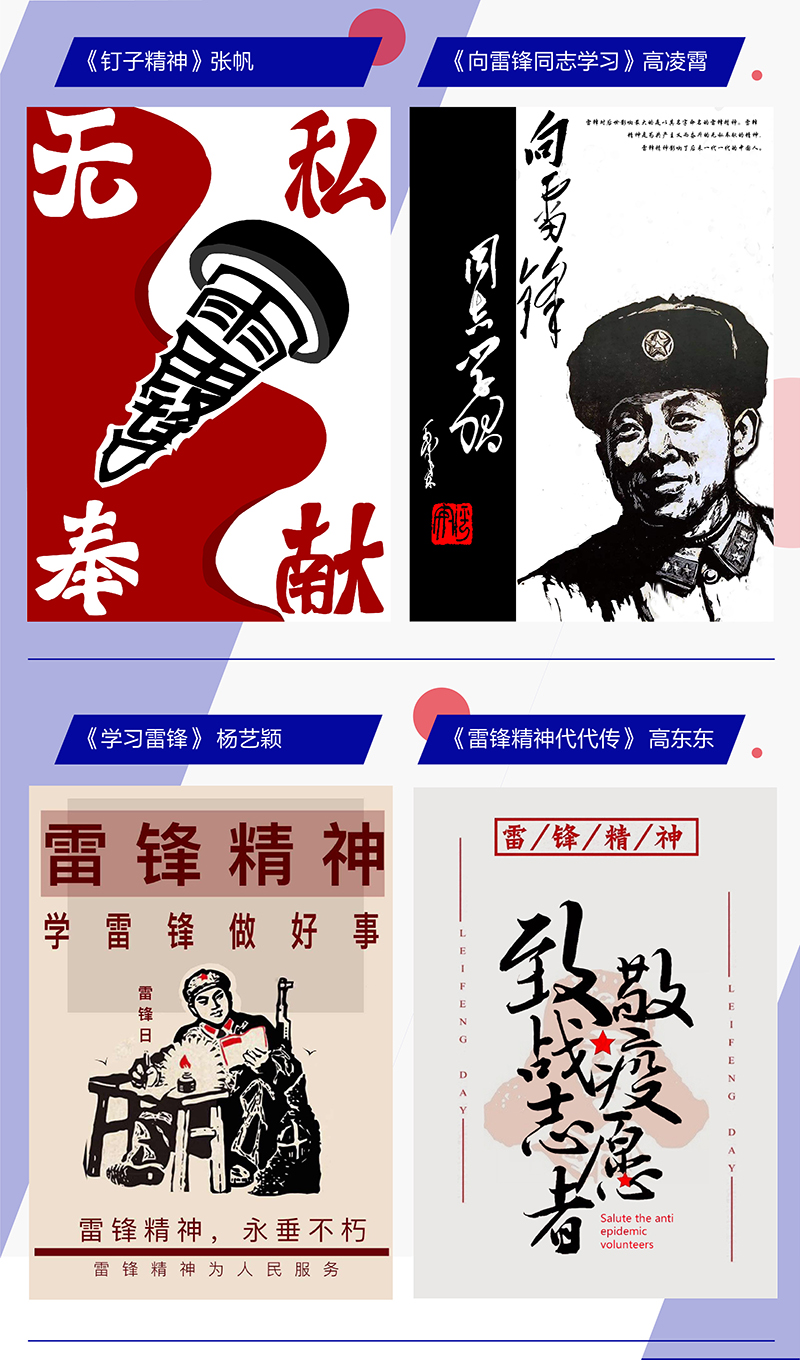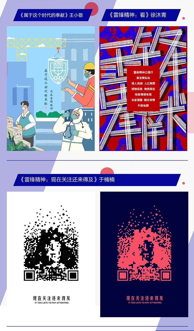 期中作品展是2018级的包装设计项目包和2019级平面广告设计项目包作品的阶段性展览。其中视觉本2018级包装设计期中作品展立意为“国潮风格”的包装设计,本次是国产品牌的提升设计,有一定的文化性、历史性、地域性、民族性。学生在完成作品设计的过程时就是一次爱国主义的教育活动,而每一个展出的作品都是一次中国文化的输出。此次包装展为学习过程的一次展示,还只停留在包装正立面的效果上,故此形式为正面效果图展示。2019级平面广告设计项目包主题为参加大学生“雷锋精神”文化研创设计大赛,展出形式为参赛海报作品,作品以挖掘雷锋精神内涵,传承新时代的民族精神为主题思想,将符号、图片、文字和色彩相结合完成设计作品。将理论知识与实践相结合提升思想道德素质与专业素养。分别由2017级、2018级、2019级和2020级专业教师带领学生到美术馆观展并做详细的讲解和说明,学生从作品展观展中受益匪浅。
