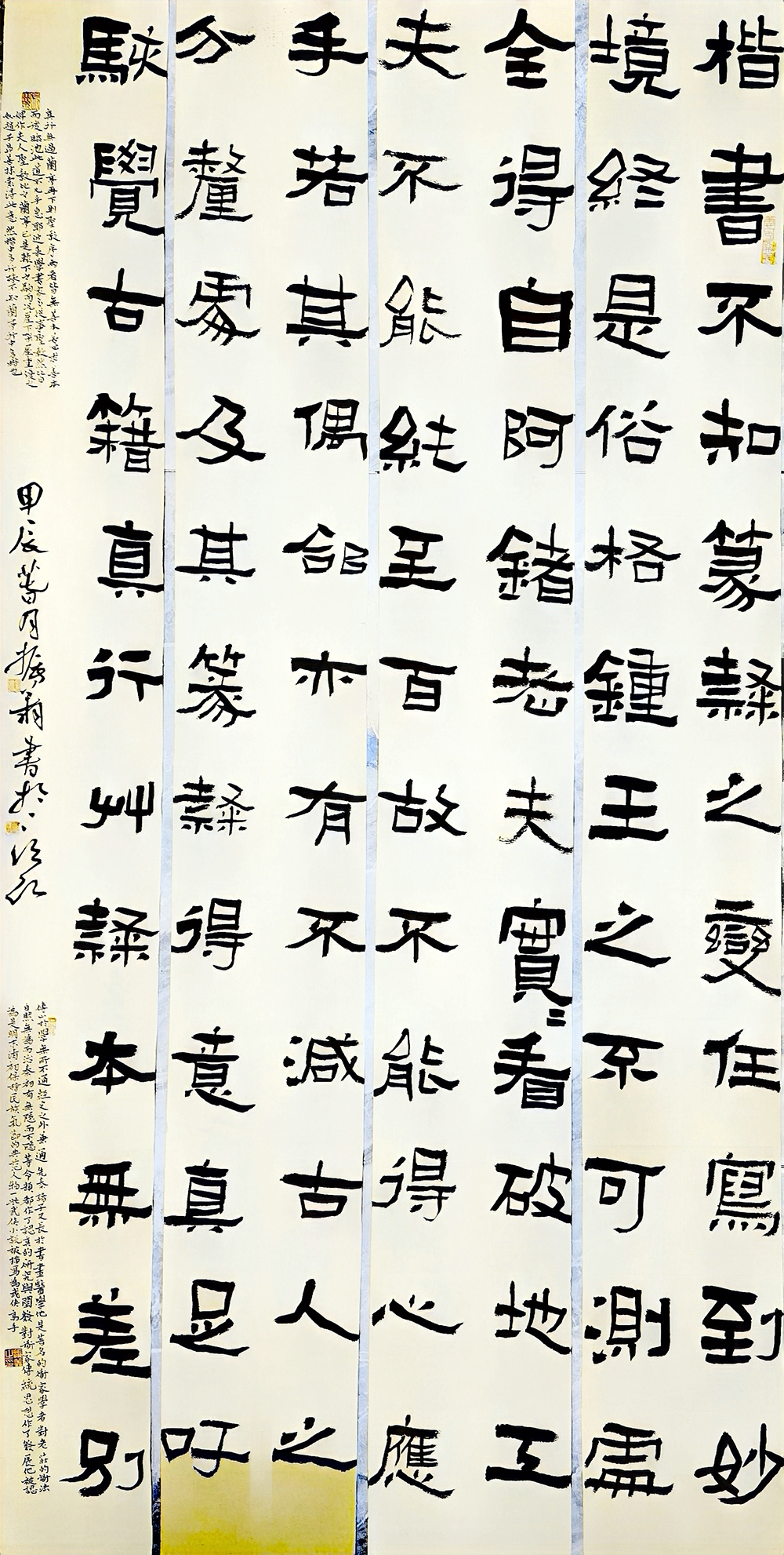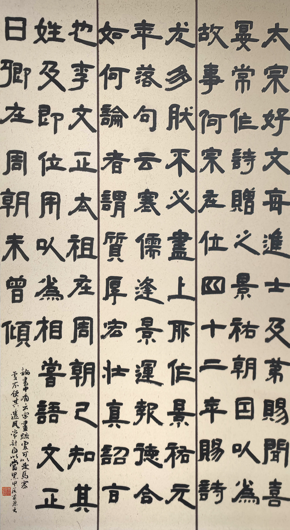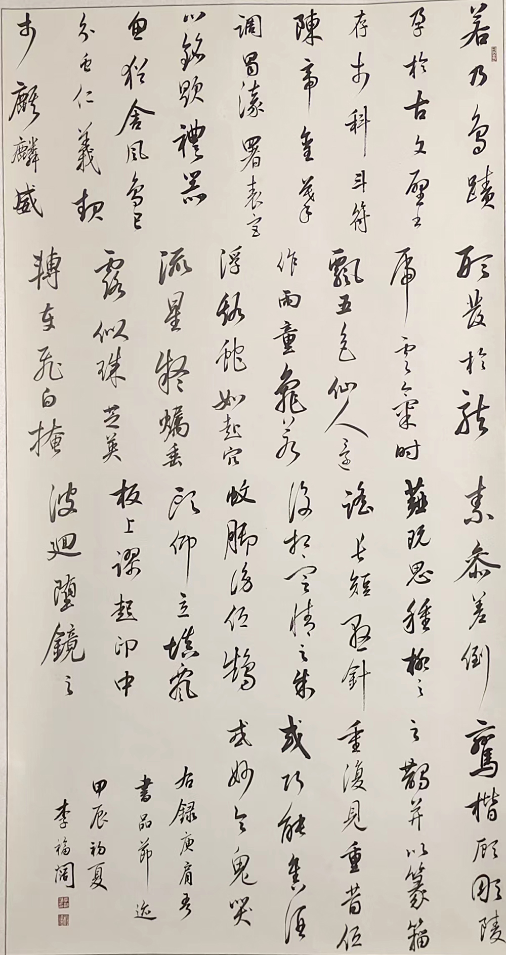 此次展览共展出20级优秀毕业作品20幅,形式丰富,书体多样,具有较强的视觉冲击力和艺术表现力,反映了艺术学院书法学专业在教学期间对传统与创新的追寻。艺术学院书法系重视书写技能的系统训练与文化底蕴的全面夯实,理论指导实践,实践验证理论,始终践行为每一位学生量身定制学习计划,因材施教,因人定标。作品创作结合国家级、省级展赛进行开展,以赛促教,以赛促学,使得学生在书法展赛中充分展示自己的专业水平,屡获佳绩,得到行业专家学者的肯定认可。目前在校学生累计获得国际国内比赛奖项100余项。其中在教育部主办的《第五届中华经典诵写讲大赛》中,赵鹏飞等5位同学获大学生专业组优秀奖;辽宁省教育厅主办的第一届、第二届《辽宁省高校师生书法大赛》中,于伟超等36名同学获一、二、三等奖;辽宁省教育厅主办的《辽宁省中外大学生中华经典诵写讲大赛》中,王文轩等9位同学获一、二、三等奖;辽宁省教育厅主办的《辽宁省“海华奖”大学生书法技能竞赛》中,宋英源获一等奖等等。