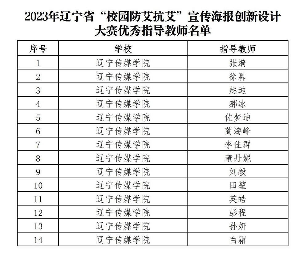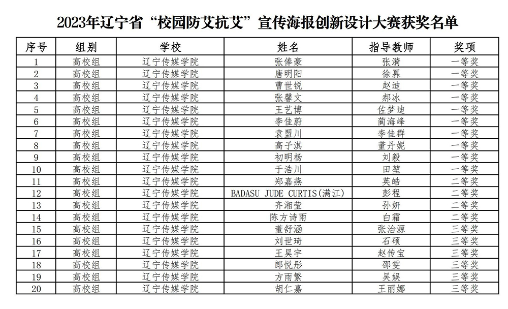 太阳集团(Macua)官方网站-www.suncitygroup.com /yssjxy/25253.html Sat, 30 Mar 2024 08:31:46 +0000 /yssjxy/?p=25253 根据辽宁省教育厅发布《关于公布2023年辽宁省“校园防艾抗艾”宣传海报创新设计大赛获奖名单的通知》,经过专家严格评审,太阳成共有20人获此殊荣,其中,一等奖10人,二等奖4人,三等奖6人;优秀指导教师14人。按照相关通知文件要求,太阳成高度重视本次设计大赛,积极组织全校师生参与申报,推选优秀学生作品参加比赛。现将名单公布如下: