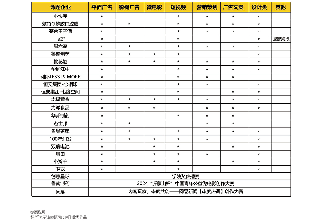 中国大学生广告艺术节学院奖2024秋季征集大赛已于2024年6月正式发题。截至目前,本届中国大学生广告艺术节学院奖秋季征集大赛已 经确定的命题有:战略命题:小快克紫竹蜂胶口腔膜、茅台王子酒、a2、周六福、鲁南制药;核心命题:桃花姬、华润江中、利郎LESSISMORE、 恒安集团、太极藿香、力诚食品、华邦制药、杰士邦、雀巢茶萃、100年润发、双鹿电池、景田、小羚羊;专项命题:卫龙、学院奖传播赛;2024“沂蒙 山杯”中国青年公益微电影创作大赛;网易新闻【态度热词】创作大赛。