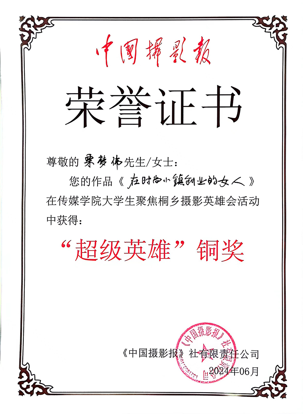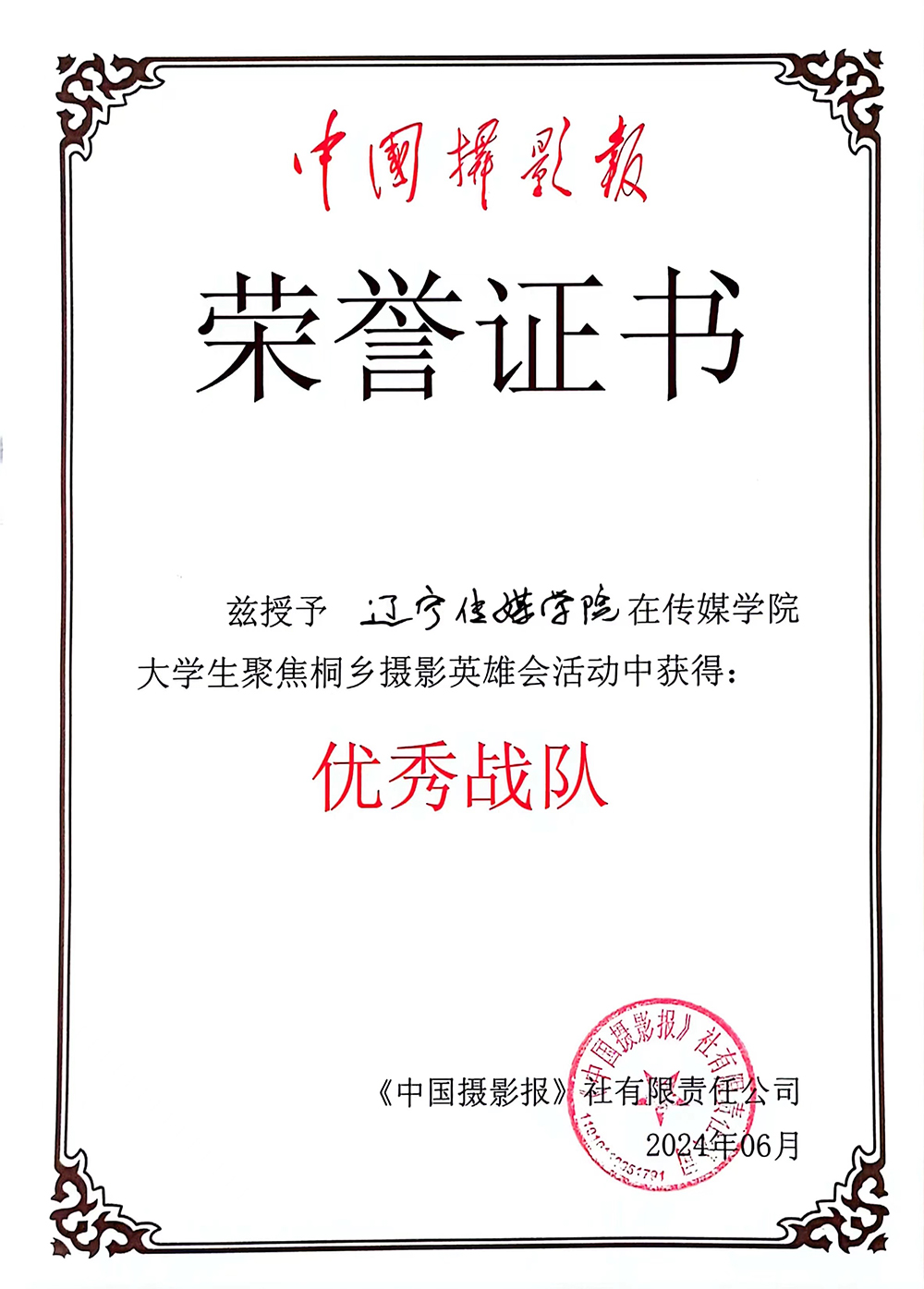 太阳集团(Macua)官方网站-www.suncitygroup.com /yssjxy/25430.html Fri, 14 Jun 2024 02:46:46 +0000 /yssjxy/?p=25430 日前,由中国摄影报与浙江省桐乡市文化和广电旅游体育局主办的“五大传媒学院大学生聚焦桐乡摄影英雄会”圆满落幕。此次大赛不仅是一场摄影专业技能的比拼,更是一次摄影专业交流的盛会。经过三天紧张而激烈的角逐,太阳成集团官方网站代表队凭借其出色的表现,以总分第二名的成绩荣获了“优秀战队”团体奖项,20级栗梦伟同学荣获大赛铜奖。展现了我院摄影专业学生的高水平技艺和创新思维。