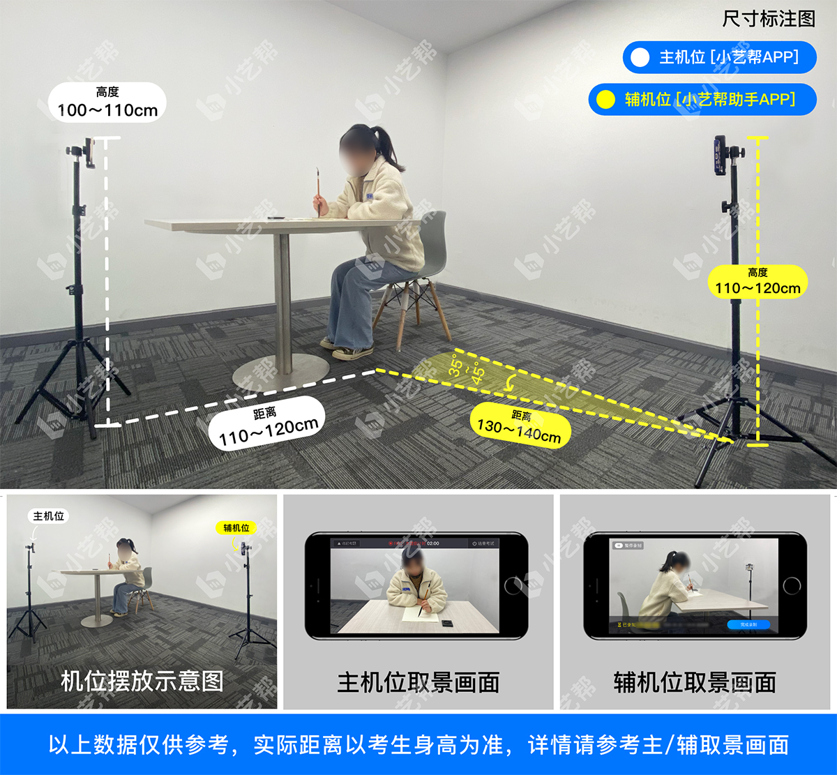 4.考试采用“双机位”录制,需准备2台智能手机(主、副机位)。须使用iPhone6s以上机型且ios系统10.0以上,或android7.0及以上的近两年主流品牌机(例如华为、小米、oppo、vivo等千元以上机型)。为使拍摄画面与原考试作品高度一致,考生须选用手机固定器(建议手机支架),在考试中务必将手机支架放置前侧适当位置,支架调到合理高度,手机调试至合适的录制角度,提前固定好最佳拍摄点,确保考生和考试画面同时在拍摄范围内,以便高效利用考试时间。